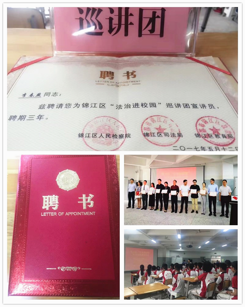 5月12日,由锦江区检察院、锦江区教育局、锦江区司法局联合举办的“法治进校园”校园宣讲系列活动启动仪式在七中育才学校汇源分校举行,太琨律品牌律师(成都)所李春燕律师经律所推荐,锦江区检察院、锦江区司法局、锦江区教育局联合审核,被聘为锦江区“法制进校园”巡讲团宣讲员,聘期为三年。