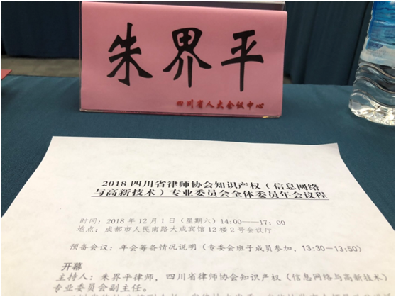 12月1日“2018四川省律师协会知识产权(信息网络与高新技术)专业委员会年会”在四川省人大会议中心召开。太琨律(成都)所主任朱界平律师参加了本次年会,并担任开幕式主持。年会开始阶段对第九届四川省律协知专委领导班子成员进行了任职证书的颁发,我所主任朱界平律师被选举为第九届知专委领导班子成员,担任知专委副主委,任期四年。