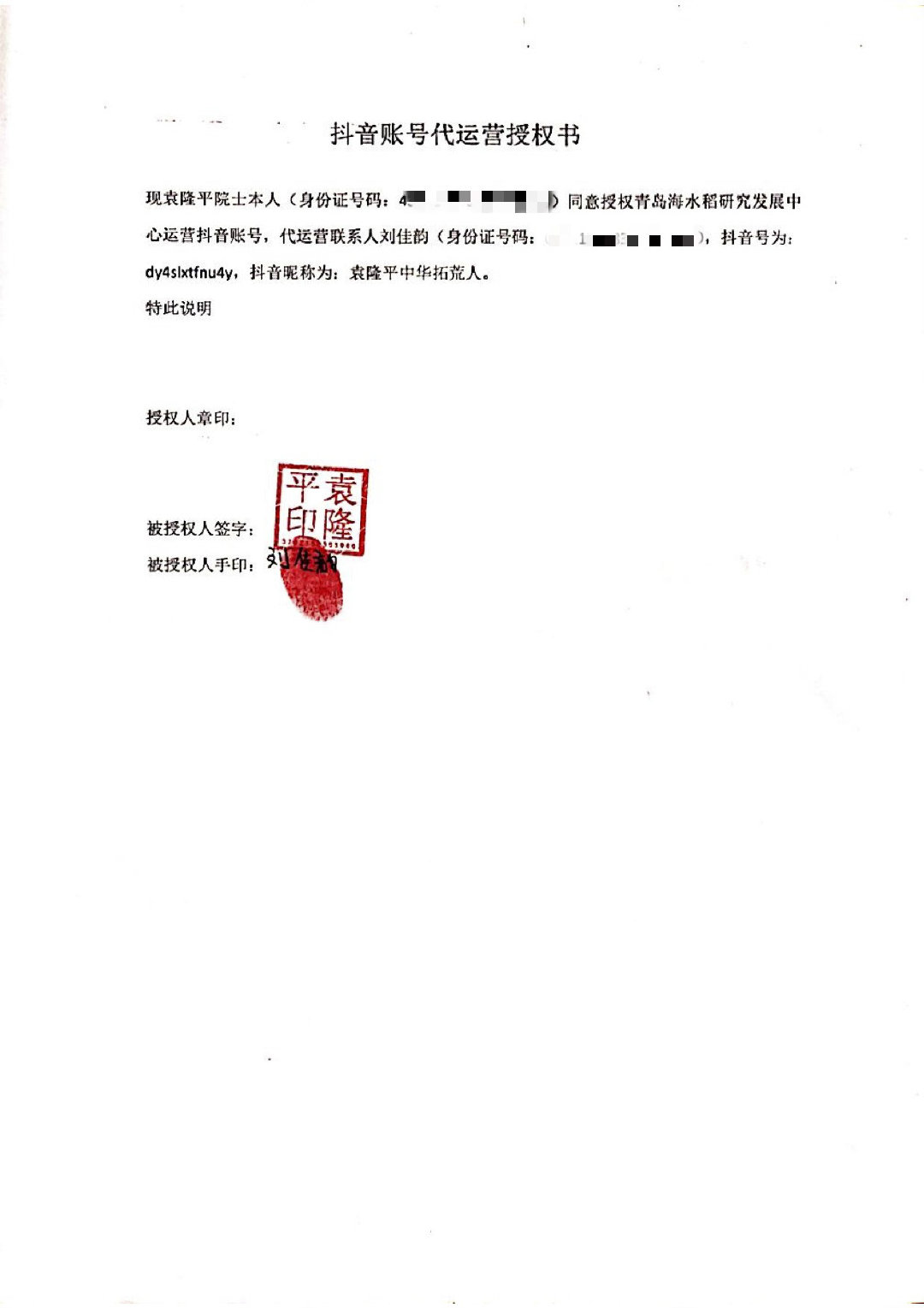 抖音官方则于11日回应了该账号的注册始末,并公布了袁隆平院士的《抖音账号代运营授权书》。2020年8月,青岛海水稻研究发展中心与抖音取得联系,就袁隆平院士入驻抖音、今日头条、西瓜视频,科普“三农”知识等方面合作进行多次沟通。2020年10月,该中心工作人员向抖音提供了袁隆平授权函和袁隆平本人身份证信息等认证必需资料,完成实名认证。