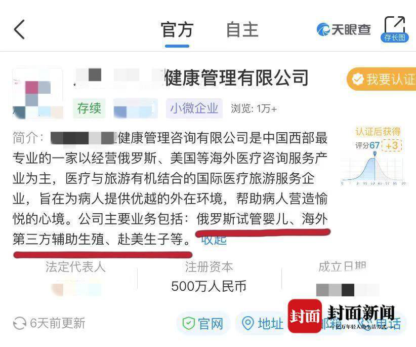 天眼查显示,这家“健康管理”公司是一家以经营俄罗斯、美国等海外医疗咨询服务产业为主,医疗与旅游有机结合的国际医疗旅游服务企业。而公司主要业务明确标注着,俄罗斯试管婴儿、海外第三方辅助生殖、赴美生子等。
