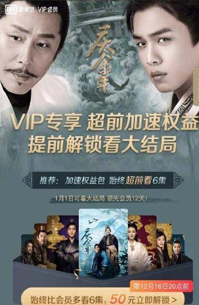 2019年12月,爱奇艺在网剧《庆余年》热映期间推出“超前付费点播”服务,即会员用户在享有抢先看6集的基础上可购买加速包,超前点播6集。