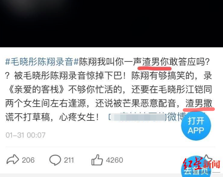 近日,明星陈翔给一女子过生日的视频引出当年陈翔与毛晓彤恋情的讨论。1月30日凌晨,陈翔深夜发文否认当年与毛晓彤交往时出轨,称两人2017年6月电话分手、9月确认分手,2017年10月1日和江铠同是约了一起做皮肤护理,正好被来拿行李的毛晓彤撞见。随后,陈翔与毛晓彤当年针对此事的通话录音被曝出。录音中称,毛晓彤当晚见到陈翔时,陈光着膀子、光着上身与女星江铠同共处一室。 这一录音,也让不少网友称陈翔为“渣男”。