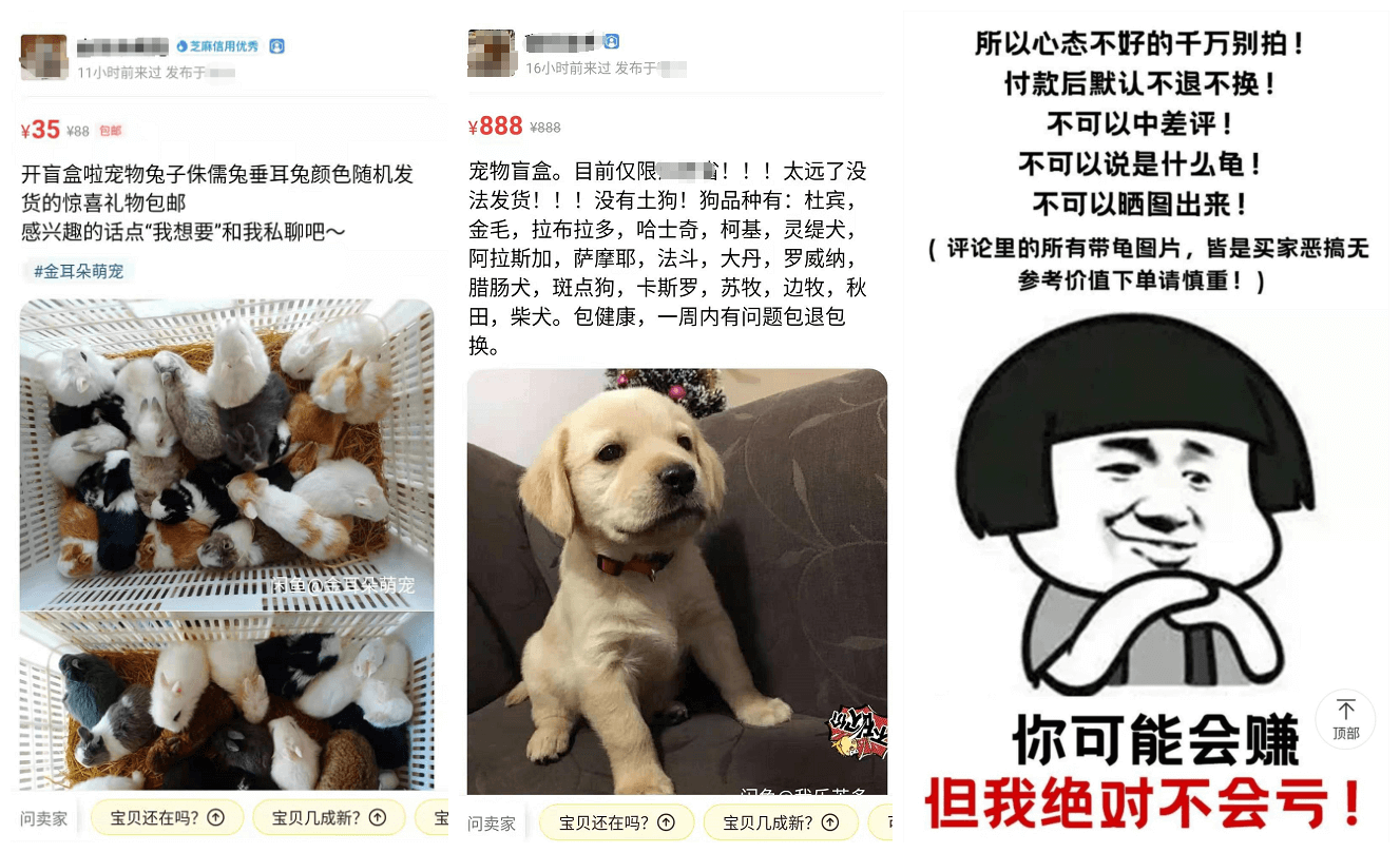 在宣传销售宠物盲盒时,多个商家都提出了“拒绝差评”的要求。某销售乌龟盲盒的商家写道:“盲盒一旦售出,不接受退换与中差评,评论不能晒实物图与品种价值。”也有商家直言“玩不起别拍”“你可能会赚,但我绝对不会亏”。