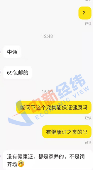 有网友表示,在销售宠物盲盒时,许多商家并不能提供宠物健康证明,只是以“死了包退换”作为“保障”。中新经纬记者以消费者身份询问几家宠物盲盒的店家是否有相关健康证明,有商家直言“都是家养的,没有健康证”。