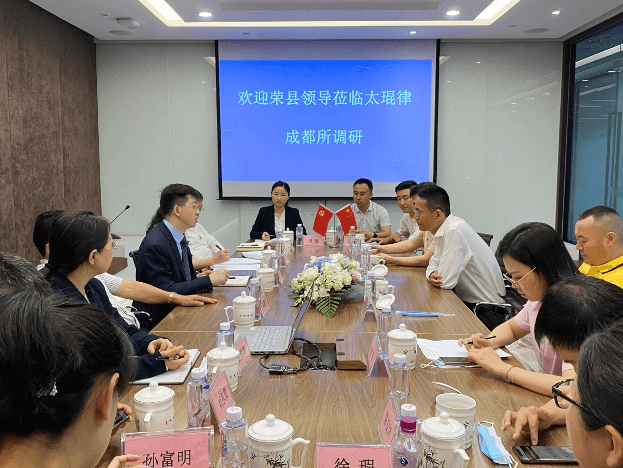 2021年5月12日上午,荣县人民政府领导和荣县成都商会领导莅临太琨律(成都)所进行调研。自贡市荣县人民政府副县长单德朋,县委统战部副部长、工商联党组书记李兵,县投资促进局局长余珊,工商联主席曹祖洪,县农民工服务中心主任曹建波,县农民工服务中心副主任涂光葫,县司法局副局长陈安洋,县工商联秘书长徐瑕,荣县成都商会筹备组组长宋遵友,衡立泰咨询公司总经理黄伯军等参加了本次调研会议。
