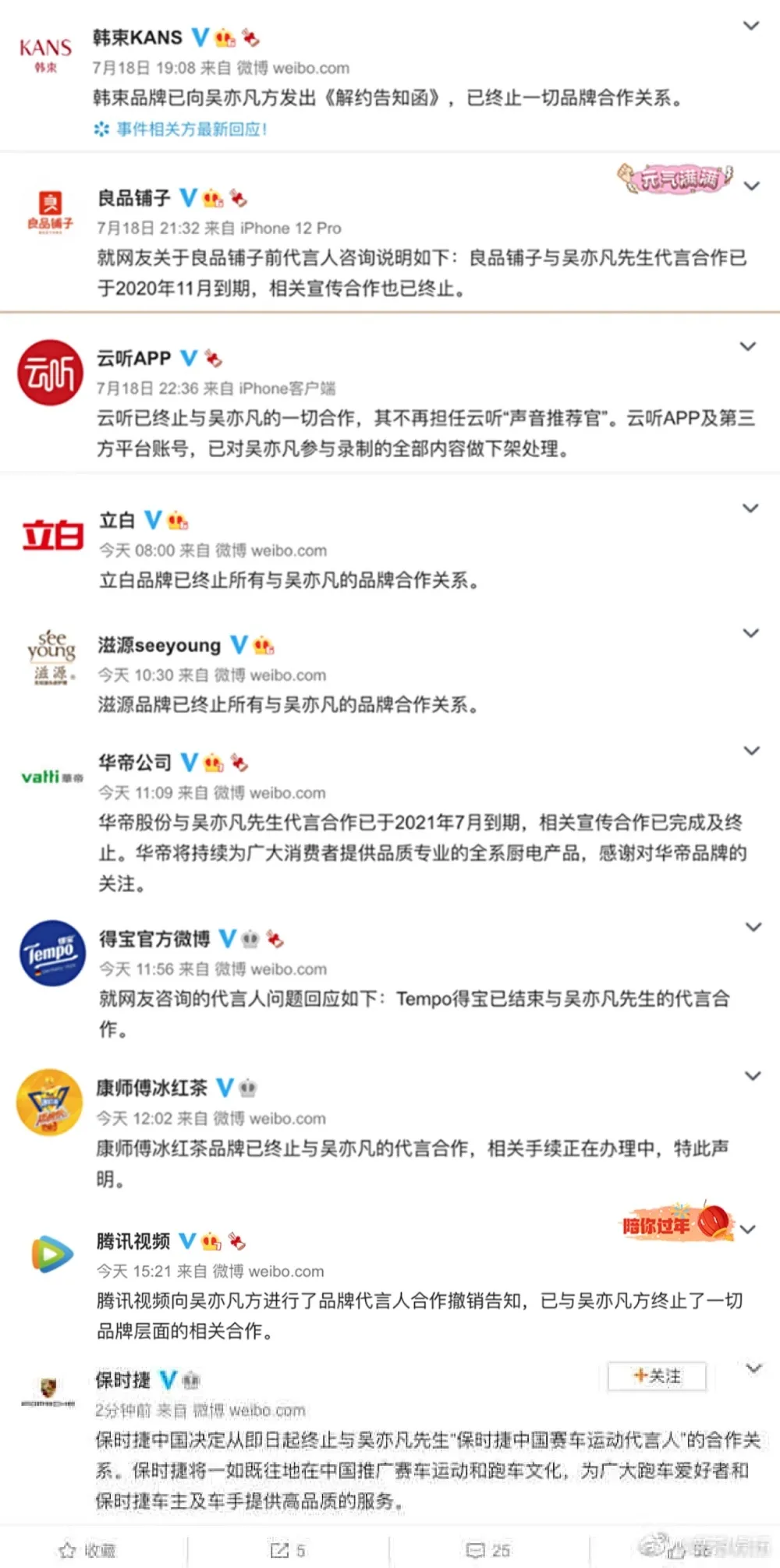 一夜之间,韩束、云听APP、立白、滋源、康师傅冰红茶、腾讯视频等约10家品牌宣布与吴亦凡终止合作,相关宣传内容也被删除。同时,还有品牌删除与吴亦凡相关的宣传信息。