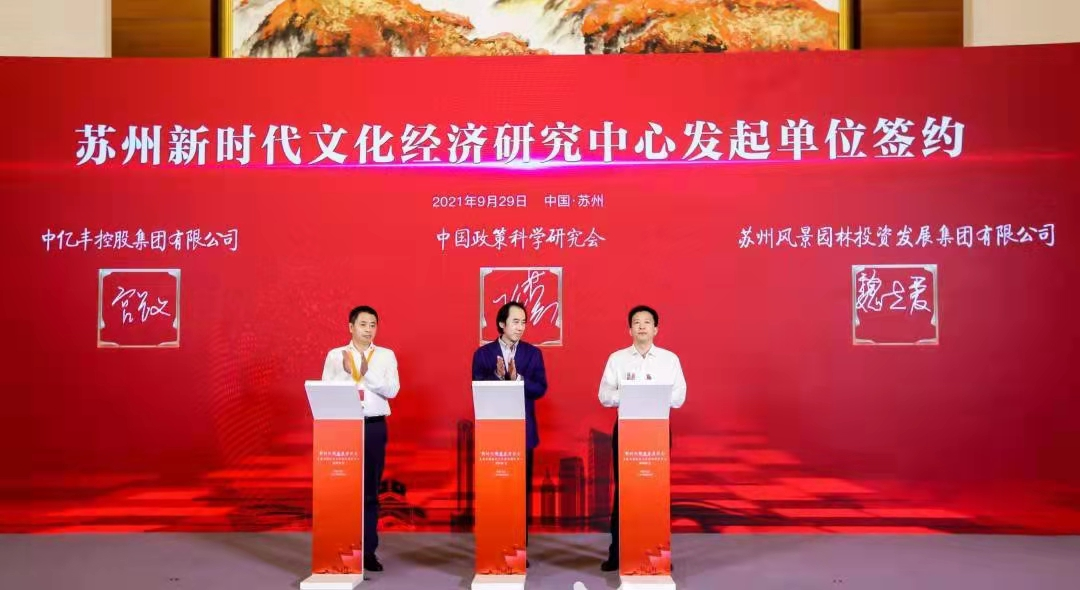 会上,滕文生、吴庆文共同为苏州新时代文化经济研究中心揭牌,苏州新时代文化经济研究中心发起单位中国政策科学研究会、苏州风景园林投资发展集团有限公司、中亿丰控股集团有限公司进行合作签约,苏州新时代文化经济研究中心与合作学术单位集中签约。