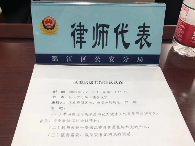 2023年2月15日下午,太琨律(成都)四川琨爵律师事务所朱界平主任作为全区两名律师代表之一参加了中共成都市锦江区委政法委员会政法工作会议。