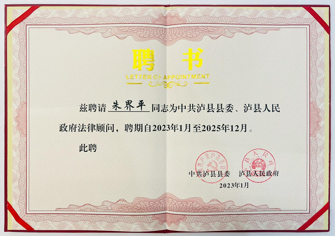 近日,太琨律(成都)四川琨爵律师事务所朱界平主任被聘为中共泸县县委、泸县人民政府法律顾问,聘期自2023年1月至2025年12月。