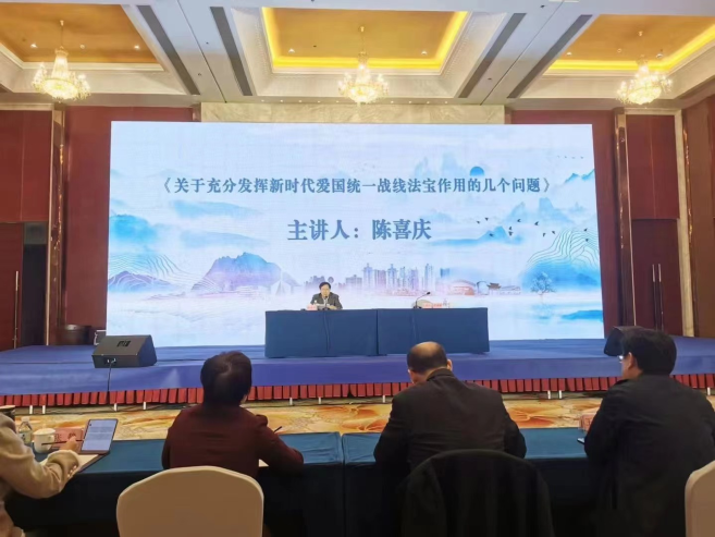 中央统战部原副部长、全国政协原副秘书长陈喜庆为会议作专题讲座。在会议第一阶段攀枝花市委常委、统战部部长马晓凤致辞,四川省委统战部机关党委书记王志军讲话。会议由全国政协委员、四川省新联会会长蓝逢辉主持。