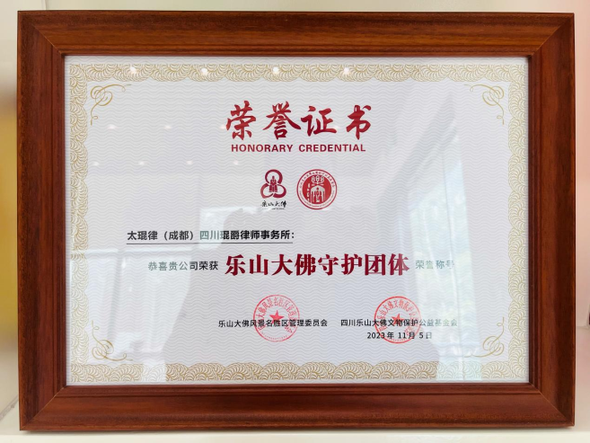 近日,太琨律(成都)四川琨爵律师事务所荣获世界自然和文化双遗产--乐山大佛全球30家团体守护人之一的荣誉称号。