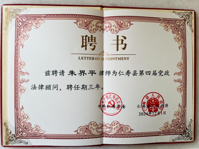近日,中国政策科学研究会特邀研究员、全国青年律师领军人才、太琨律创始合伙人、太琨律(成都)四川琨爵律师事务所朱界平主任被聘为仁寿县委、县政府法律顾问,聘任期三年。