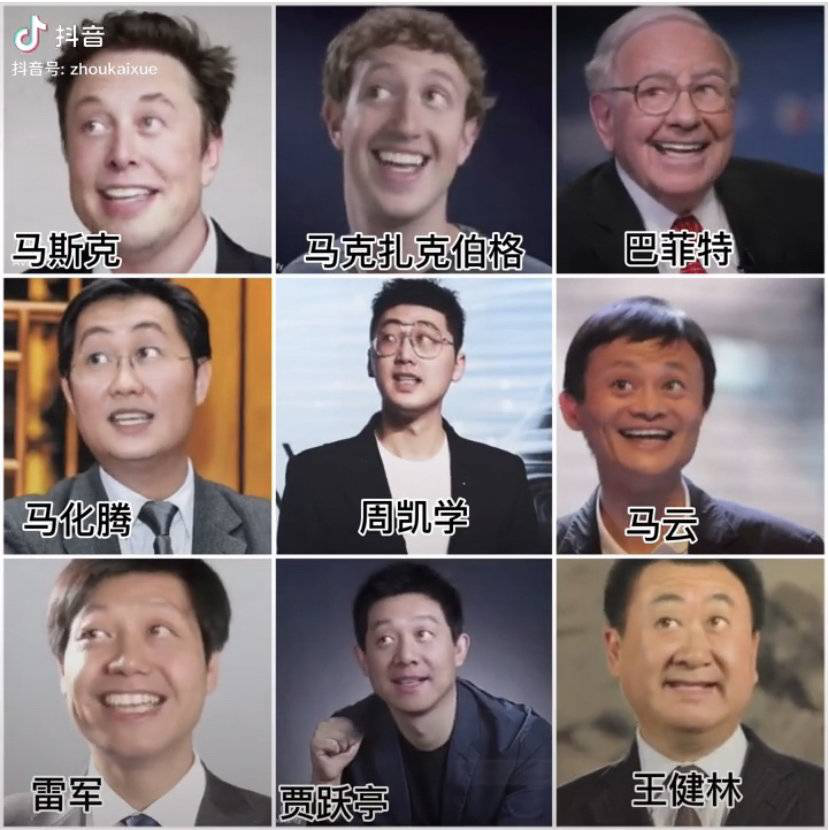 在这些视频中,除了制作者的亲朋好友开始“蚂蚁呀嘿”魔性晃动外,还有如巴菲特、马斯克、马云、雷军、比尔盖茨、马化腾等名人也都被恶搞,之后随着一些明星加入创作,该特效被推向新的高潮。