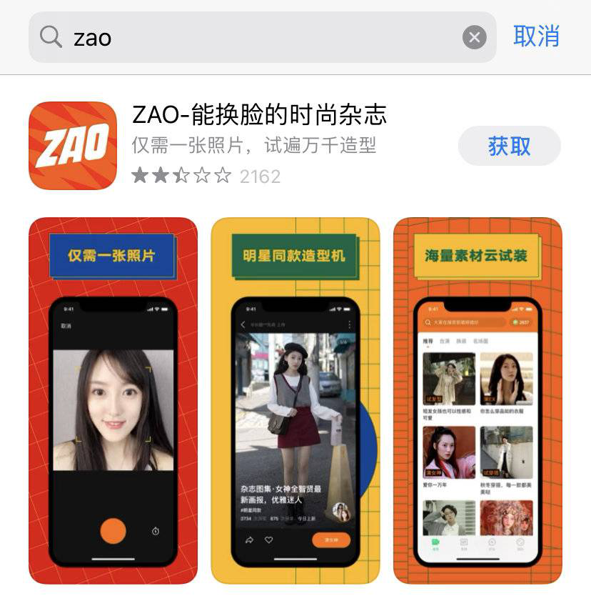 3月4日,记者在App Store搜索到ZAO,其目前的标签是“能换脸的时尚杂志”,主要功能是通过AI技术换脸,尝试不同的妆容、发型和服饰。但重要的是,目前该软件制作的视频不能保存、不能截屏、不能分享。