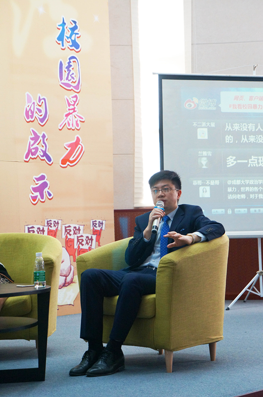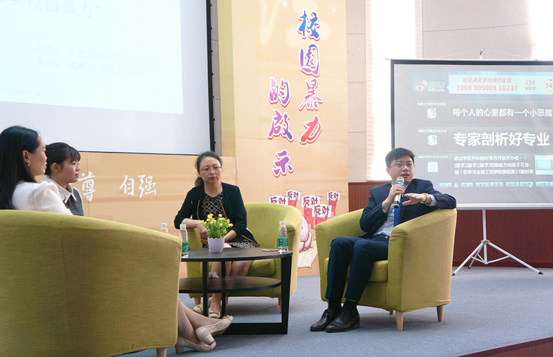 此次访谈还邀请了成都大学政治学院副院长邓陕峡教授、成都大学政治学院法学系唐文娟副教授,三位嘉宾和学生共同探讨“校园暴力”话题,并从专业角度去引领同学们了解、认识和防治校园暴力。