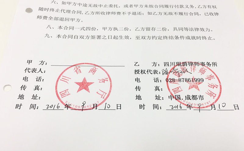 9月18日,四川省商务厅因设立驻德国商务代表处事务需要,特聘请太琨律品牌律师(成都)四川琨爵律师事务所法律事务部陈喻瑕律师为专项法律顾问,作为其在中国相关项目代理。陈喻瑕律师曾为多家大中型企业、上市公司提供法律服务,理论功底扎实、颜值与才华并存。对于此次受聘,陈瑜暇律师表示会尽职为四川省商务厅贡献自己的力量。太琨律品牌律师做为一家国际化的精英律师品牌,致力于为国内外各大企业机构提供高品质法律服务。
