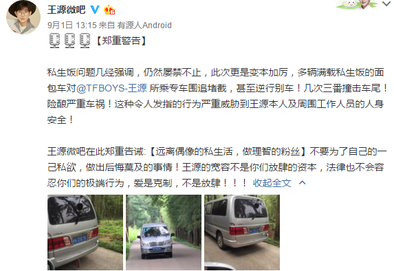王源微吧发文警告私生饭:“远离偶像的私生活,做理智的粉丝!不要为了自己的一己私欲,做出后悔莫及的事情!王源的宽容不是你们放肆的资本,法律也不会容忍你们的极端行为,爱是克制,不是放肆!”回应今日王源在前往工作地点的途中险些被私生饭追车撞车一事。
