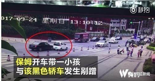 在马路上发生刮擦后,保姆下车交涉,但后面的黑色轿车司机下车一直在打电话,之后保姆开车到前方人行道停车。