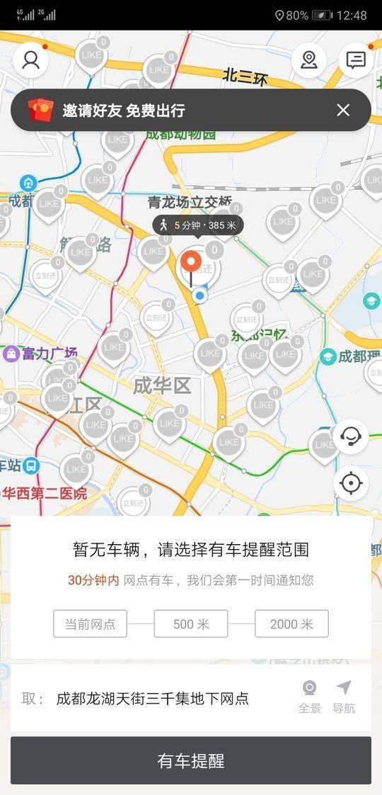 随后,记者打开了立刻出行APP,可地图上的用车点、换车点,都显示可用车辆数量为0,实际上,立刻出行在成都已经无车可用。