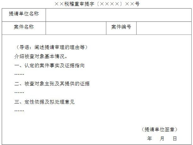 1.本提请书由提请单位提请审理委员会审理案件时填写。文书由案件提请单位编号,“××税稽重审提字〔××××〕××号”分别填写单位规范简称、审理年度、和提请书序号,如:云地税稽重审提字〔2014〕1号,下同。