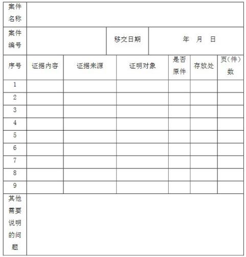 3.“证据内容”填写:账簿凭证、检查文书、法律依据、被查对象陈述申辩材料、听证笔录等。“证据来源”填写证据系从何处取得、由谁制作。“证明对象”填写证据证明的案件事实。“是否原件”,一般应提交原件,提交原件原物确有困难的可以提交复制件或照片等。“存放处”填写无法当场移交的证据及其他资料的存放地点。对于无法现场移交、但列入证据目录的证据,接收人可以到存放现场查验后再签字确认。
