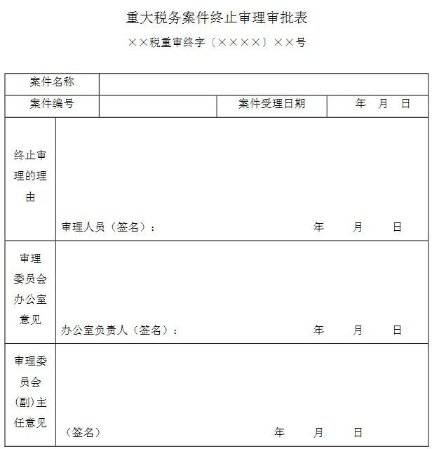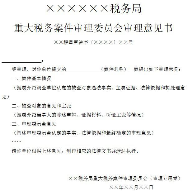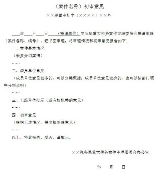 1.本文书由重大税务案件审理委员会办公室向审理委员会报告初审意见时填写。