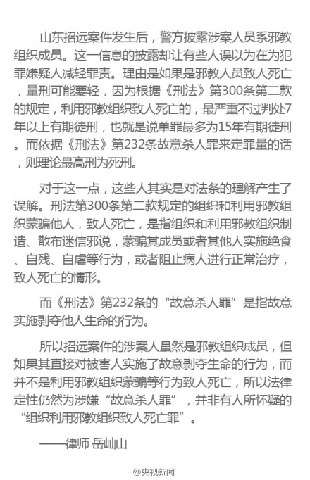 【网传刑法第300条“利用邪教杀人定罪最多7年以上” 并不适用本案】山东招远案发生后,警方披露涉案人员系邪教组织成员。这一信息却让有些人误以为在为犯罪嫌疑人减轻罪责。其实,警方在通告上称本案是“涉嫌故意杀人罪”,而非“组织利用邪教组织致人死亡罪”。因此理论最高刑为死刑。