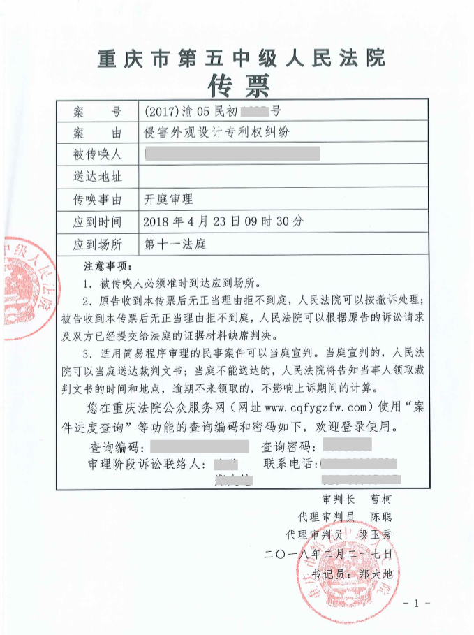 2018年4月23日09时30分,太琨律(成都)知识产权部律师团将代理原告在重庆市第五中级人民法院开庭。该案为重庆某单位涉嫌侵害原告外观设计专利权纠纷一案。太琨律(成都)知识产权法律事务是太琨律的核心法律领域之一,太琨律知识产权法律事务团队由具有丰富的执业经验、深厚的理论功底与出色的诉讼技巧的精英律师队伍组成。