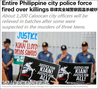 [观察者网综合报道]8月中旬起,菲律宾“禁毒战争”出现多次争议,8月21日,加洛坎市(Kaloocan)一名17岁学生被警方开枪打死,此后又有两名少年的父母指控当地警察施暴致孩子死亡。另有一段监控视频显示,当地多名警察闯入民居,夺走财物。
